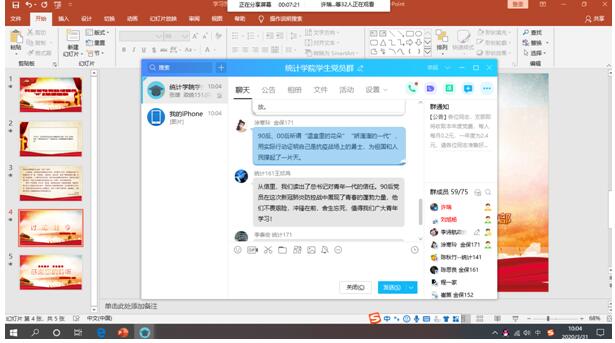 大会第二项由组织委员李诗航带领大家进行线上讨论,分享自己的学习心得,大家展开积极讨论并踊跃发言,16级经济统计学专业预备党员李财智说:“我认为习近平总书记的回信中说提到的精神即:90后党员要起到带头作用,先锋作用。有理想有担当有本领是我们的本质工作,不畏艰险、冲锋陷阵、舍生忘死是我们应有的品质。”17级统计专业预备党员李泰宏说:“习近平总书记给北大援鄂“90后”党员的回信,是对广大奋战在一线的青年党员寄予鼓励和赞扬。“青年兴则国家兴,青年强则国强”,新时代的青年是有责任、有担当、有理想的一代,我们作为青年党员,要努力磨砺意志品质、练就过硬本领,只有这样,才能担当得起时代赋予的重任。”bevictor伟德官网19届研究生兼班长的张雄谈到:“习近平总书记给北大援鄂医疗队全体“90后”党员的回信中,处处都透露出总书记对新一代青年人的殷切期盼,对他们无私奉献、不畏艰难险阻,奋勇向前精神的肯定与赞赏,对他们将国家安危时刻放在心上的欣赏。当代青年是有责任、有担当、有理想的青年。只要我们齐心协力,紧紧跟随中国共产党的步伐,严格要求自身,共同努力,就一定能够渡过难关。”