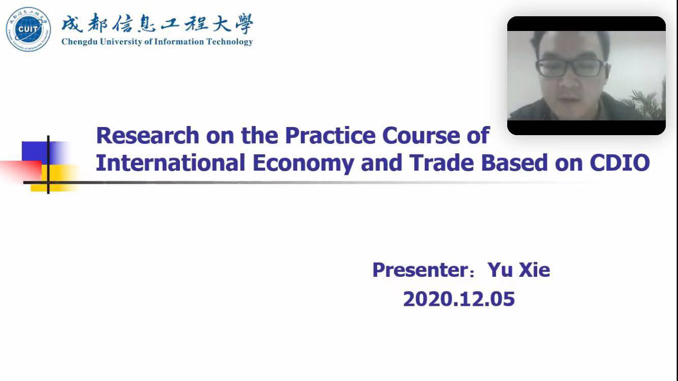 同时,公司研究生谢宇代表团队做了题为Research on the Practice Course of International Economy and Trade Based on CDIO(《基于CDIO的国际经济与贸易实践课程探索》)的汇报。从CDIO内涵、国际贸易本科是培养特点切入,介绍了国际贸易实践课程体系的目标、评估角度,并分享了《外贸函电》和《国际商务谈判》两门的实施成果,总结经验,以迁移到其他学科或课程的设计。汇报收到与会者高度赞扬。