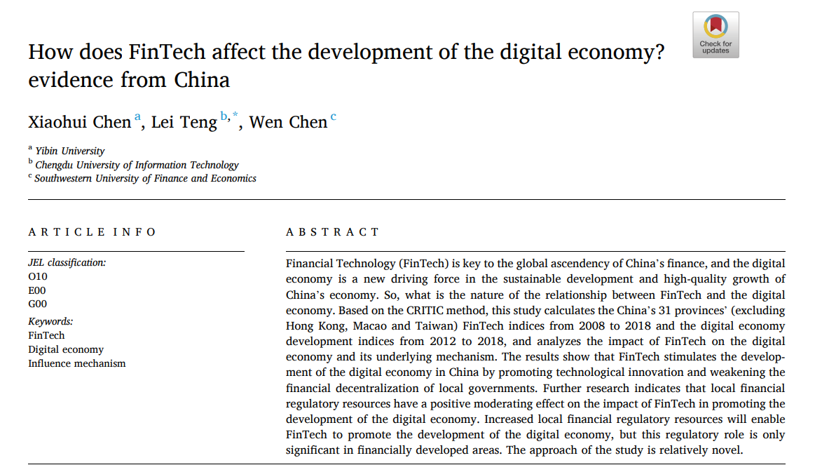文章《金融科技如何影响数字经济发展?来自中国的证据》,从传统技术创新和金融分权两个维度进行机制分析,然后基于零壹智库数据,采用时间和个体双向固定效应模型,研究金融科技对数字经济的影响及其机制。实证结果表明:第一,金融科技可促进数字经济发展,其机制在于金融科技可促进地区传统技术创新、弱化地方政府金融分权,后两者均有利于数字经济发展。第二,地方金融监管资源具有正向调节作用,随着地方金融监管资源的增加,金融科技促进数字经济发展的作用更加突出。在国家大力发展数字经济,地方政府负责处置本地金融风险的背景下,该文的研究结论为地方政府借助于金融科技创新实现数字经济发展提供新的支持。