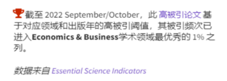 据悉,基本科学指标数据库(简称ESI)是美国科技信息研究所(ISI)2001年推出的科学研究绩效、学科发展趋势的评价工具,是汤森路透基于SCI(科学引文索引)和SSCI(社会科学引文索引)收录的全球11000多种学术期刊的1000多万条文献记录而建立的数据库。当前,ESI已成为当今世界范围内普遍用来评价高校、学术机构、国家/地区国际学术水平及影响力的重要评价指标工具。据ESI数据库的界定,高被引论文是同一年同一个ESI学科中发表的所有论文按被引用次数由高到低进行排序,排在前1% 的论文。通俗来讲,就是在同一年中的同一个ESI学科中的被引用最多的,排在最前面的高水平论文。