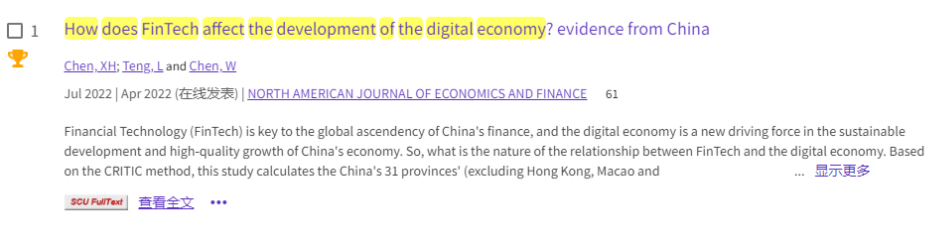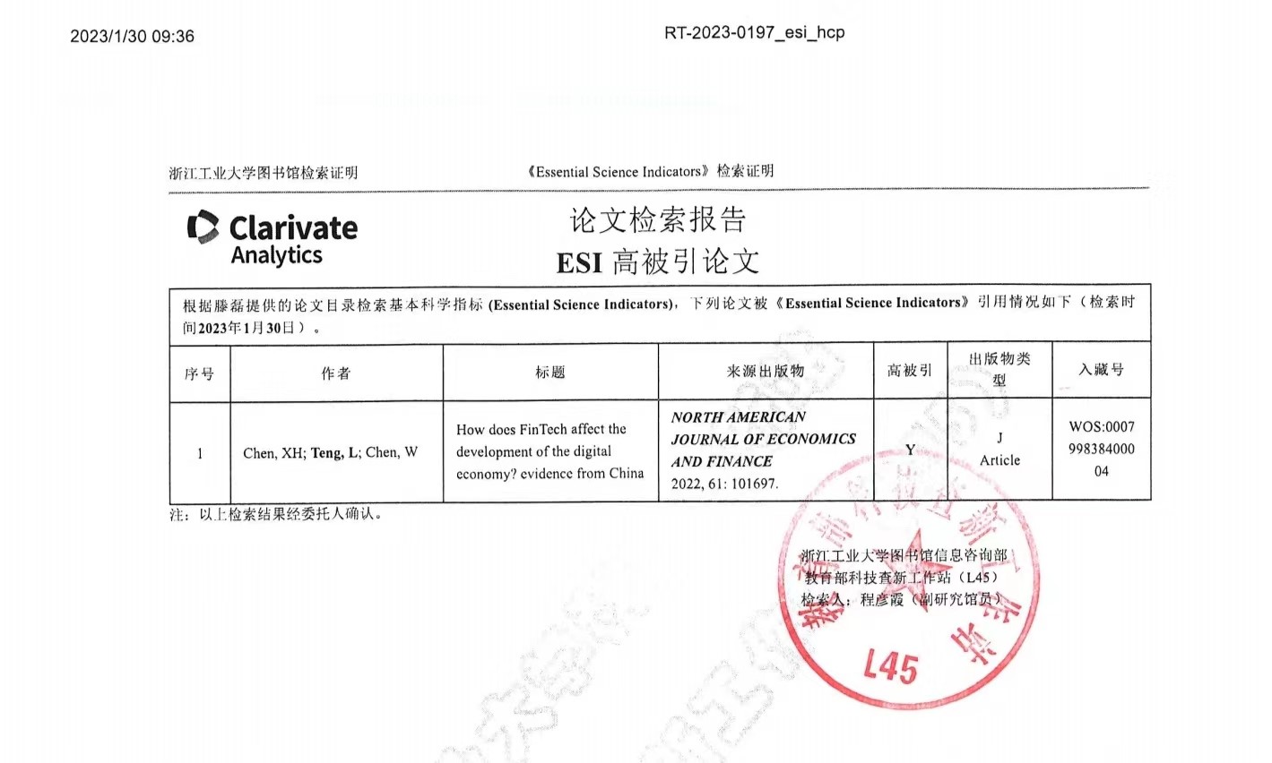 近日,根据ESI(Essential Science Indicators)公布的最新数据,公司副经理滕磊教授作为通讯作者在国际知名期刊《North American Journal of Economics and Finance》(SSCI)发表的有关数字经济的论文《How does FinTech affect the development of the digital economy? evidence from China》成功入选全球前1% ESI高被引论文。该文的共同作者还包括宜宾公司陈小辉博士,南京农业大学陈文副教授(之前任职于西南财经大学)。